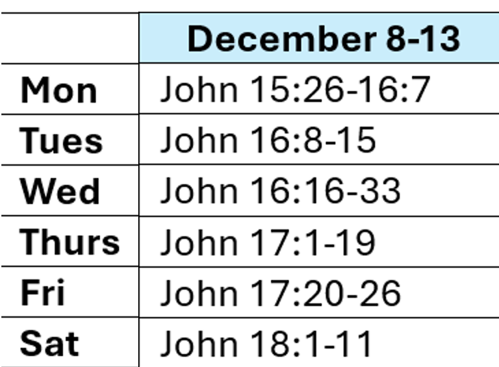 The reading schedule is adapted for 2025 from one created by Bob Rognlien*, and is meant to be part of a slow, prayerful devotional every Monday through Saturday. With a daily reading of around 10-15 verses at a time, it is paced to give space to reflect on Jesus’ words and actions and how they connect to our lives today. Click hereto learn more